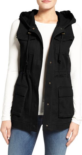 Ready for any urban mission, a military-inspired utility vest is cut from rugged-looking stretch-cotton twill with a quartet of flap pockets to stow your essentials. Drawstrings at the hood and waist refine the fit.