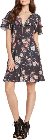 Frilly rows of ruffles add to the sweetness of a stem-showing dress that's patterned in a pretty garden of blooms.