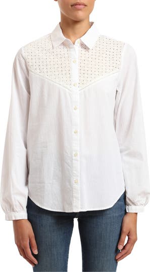 Eyelet Embroidered Yoke Cotton Poplin Button-Up Shirt