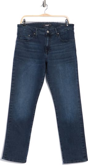 Prominent fading and whiskering highlight the dark-blue wash of jeans that are made from cotton in a comfortable, relaxed fit with a touch of stretch for easy movement.