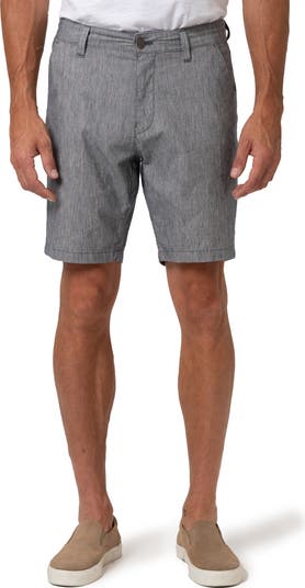 A softly slubbed blend of cotton and linen woven in subtle pinstripes makes a warm-weather favorite of chino shorts that offer a touch of stretch for all-occasion comfort.
