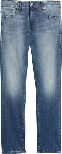 Heavy sanding through the thighs brings a relaxed, well-worn look to classic straight-leg jeans made from lightweight stretch denim.