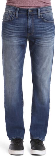 A worked-in straight-leg style right out of the gate is crafted from comfortable, dark-washed denim that's been faded and sanded at the natural wear points.