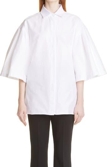Exaggerated cape sleeves flare out from the dropped shoulders of this cotton poplin shirt for a dramatic take on the classic button-up.