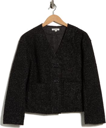 Stay cozy on chilly days in this bouclé-knit cardigan fashioned in a cropped silhouette with handy patch pockets.
