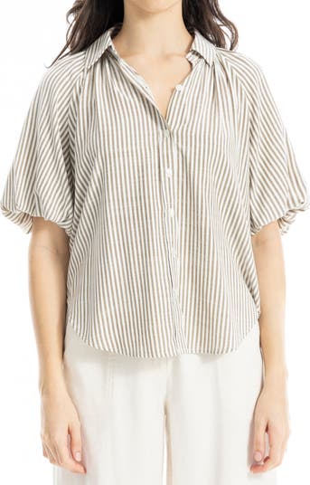 Crisp stripes and a lightweight woven construction lends a refreshing finish to this button-front top framed with elbow-length bubble sleeves and a spread collar.