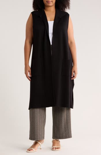 A longline silhouette increases the warmth and comfort of a sweater-vest fashioned with an open front for quick and easy layering.