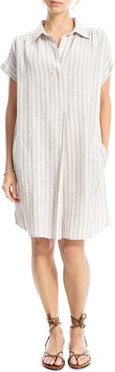 Faded, variegated pinstripes give a vintage look and feel to this collared dress that's cut in a loose fit to be comfortable throughout wear.