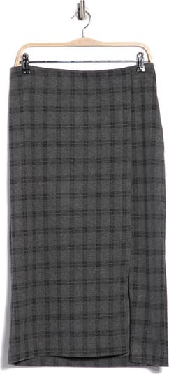 A faux-wrap silhouette brings on-trend appeal to a woven midi skirt covered in classic plaid checks to bring sophistication to casual or elevated looks.