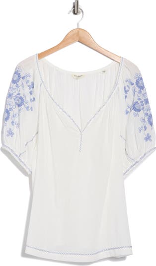 Embroidered flowers bring whimsical charm to this lightweight cotton-blend top framed by elbow-length puff sleeves.