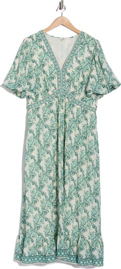 A vintage-inspired floral print charms on this Empire-waist maxi dress framed by fluttery sleeves and a ruffled flounce hem.