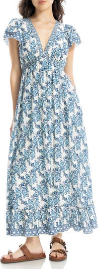 A charming floral print covers this flowy maxi dress designed with a deep V-neckline, cap sleeves and handy pockets.