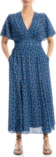 Fluttery sleeves enhance the whimsical charm of a flowy chiffon maxi dress framed by a surplice V-neck and handy side pockets.