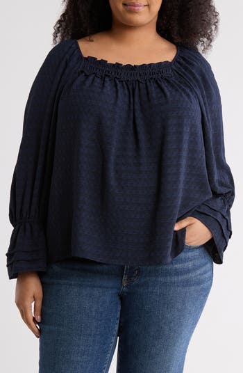 Ruffled edges and fluttery cuffs make a sweet statement against this woven top that's a stylish refresh to your day-off rotation.
