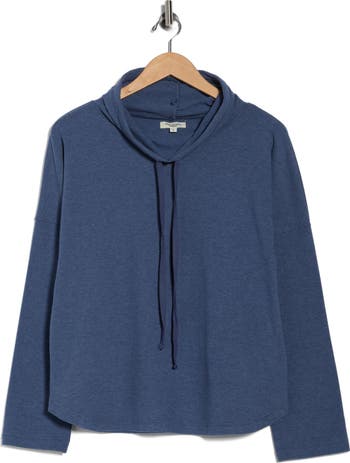 A funnel neckline amplifies the laid-back appeal of a roomy pullover made with a touch of stretch to ease every movement.
