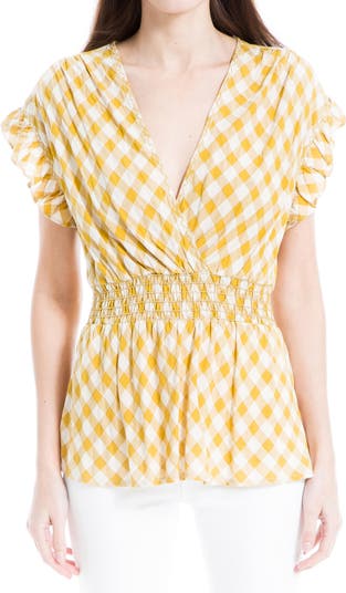A smocked waistline centers this gingham blouse fit the most flattering peplum hem and flutter sleeves.