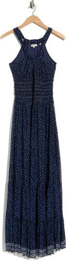 A gathered waist shapes this tiered maxi dress framed by a halter neckline and patterned in polka dots.