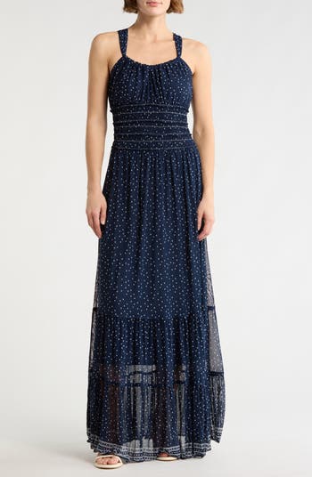 A gathered waist shapes this tiered maxi dress framed by a halter neckline and patterned in polka dots.