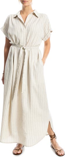 Lightweight fabric blended with linen defines this shirtdress designed in a maxi silhouette with a hidden-button placket.