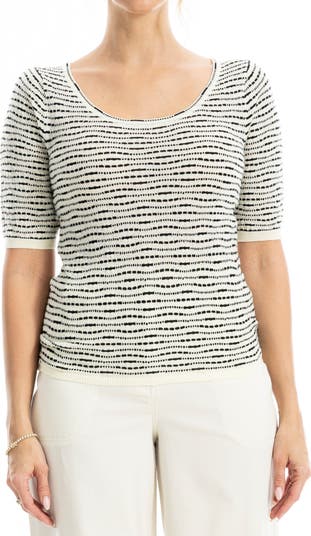 Move into warmer weather with this lightweight, fitted sweater featuring a scoop neck, elbow sleeves and a groovy pattern.