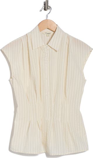 Crisp pinstripes neatly trace the pintuck pleats of this sleeveless button-front shirt cut from a breathable, lightweight fabric blend kissed with cotton for added softness.