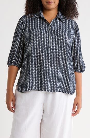 Puffed three-quarter sleeves and a point collar frame a lightweight top secured with a button half placket.