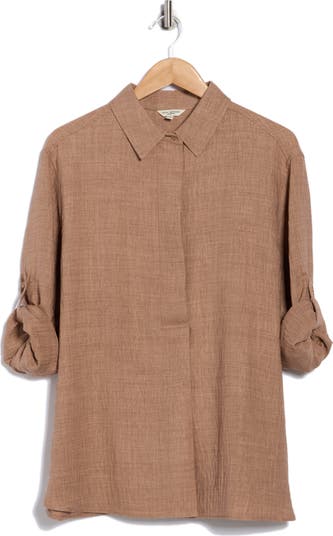 Refresh your workday essentials with this collared shirt framed by a hidden-button half placket and roll-up sleeves for contemporary style.