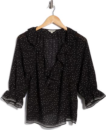 Fanciful frills trace the V‑neckline and front of this flowy, bloom‑covered top that brings effortless charm to weekend dressing.