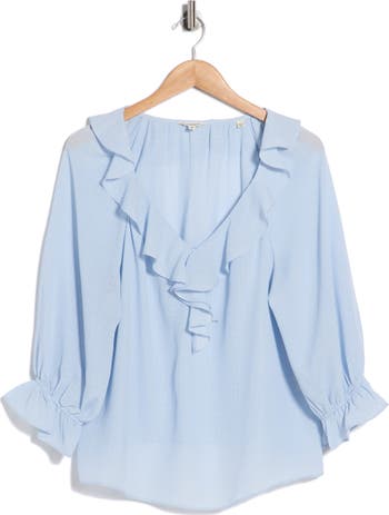 Cascading ruffles around the neck and cuffs put a romantic spin on this ethereal V-neck top.