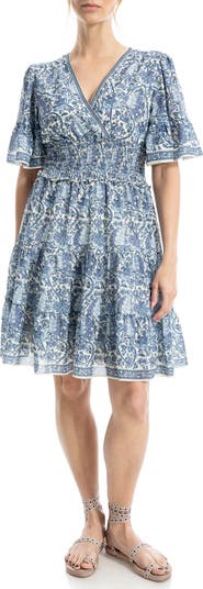 A charming floral print enhances the whimsical appeal of a fit-and-flare dress fashioned with fluttery sleeves, a wide smocked waist and flounced hem.
