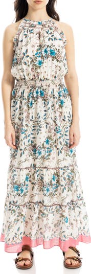 A garden of flowers blooms upon this sleeveless maxi dress cut from georgette fabric in a tiered silhouette.