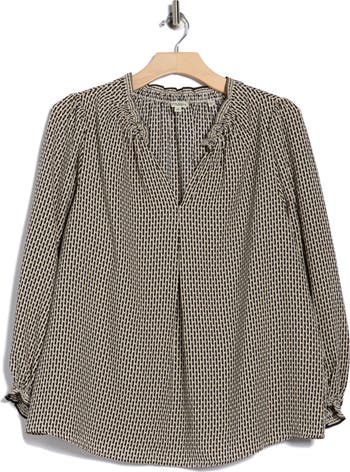 A ruffled, split neck and gently puffed sleeves frame this lightweight crepe top that transitions easily from the workday to weekend.
