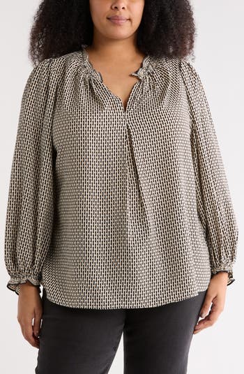 A ruffled, split neck and gently puffed sleeves frame this lightweight crepe top that transitions easily from the workday to weekend.
