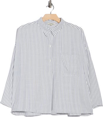 Evoke polished style in this striped button-up shirt featuring three-quarter sleeves and a chest patch pocket.