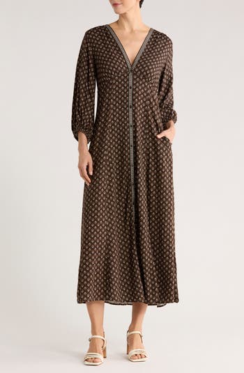 Easily go from the farmers' market to weekend brunch in this maxi-length dress styled with puffed three-quarter sleeves and a V-neckline.