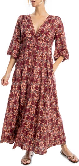 Easily go from the farmers' market to weekend brunch in this maxi-length dress styled with puffed three-quarter sleeves and a V-neckline.