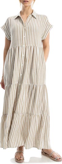 A tiered silhouette adds graceful movement to this maxi shirtdress cut from lightweight striped fabric and finished with handy pockets.