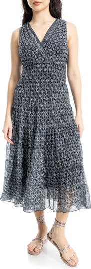 A sleeveless A-line midi dress features a paneled flared skirt with a floral print for feminine style.