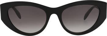 A gleaming etched logo decorates the bold design of these modified cat eye sunglasses complete with UV-shielding lenses for stylish eye coverage.