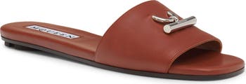 A chunky cross-bar buckle engraved with the McQueen logo adds a striking element to this flat slide crafted of smooth calfskin.