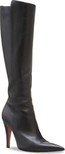 An asymmetric topline adds to the distinctive look of this calfskin leather boot framed with an elongated pointy toe and skeleton-embossed heel.