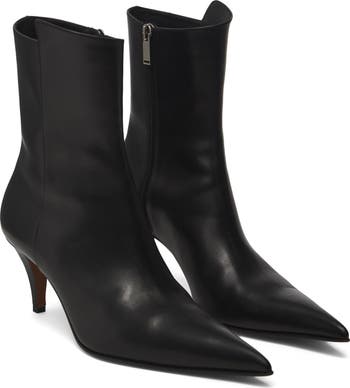 An asymmetric topline adds to the distinctive look of this runway-featured leather bootie framed with an elongated pointy toe and skeleton-embossed heel.
