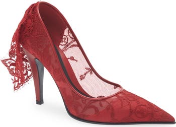 Eyelash-trimmed lace cascading past the counter creates captivating movement as you walk in this Italian-made pump sharpened with a dramatic pointy toe.