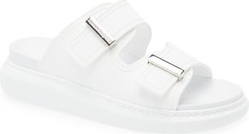 Streamlined bar hardware underscores the modernist styling of this double-band rubber slider boosted by an oversized, chunky platform with a leopard-debossed sole.