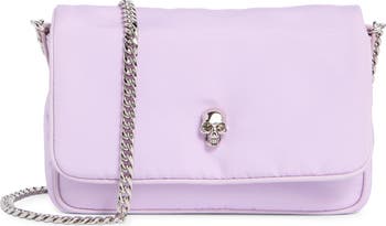A grinning crystal-eyed skull at the flap gives a touch of Gothic edge to a structured bag suspended from a gleaming chain strap.