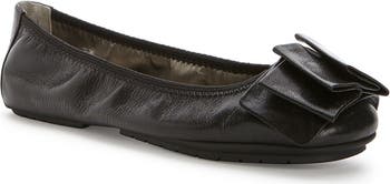Layered, origami-inspired folds grace the toe of a soft leather flat designed with Me Too's new pillow-ribbed, foam-cushioned footbed and heel pad for extra comfort.