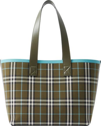 Heritage Burberry check patterns this roomy cotton-canvas tote framed with topstitched calfskin trim and furnished with a tethered zip pouch for small items.