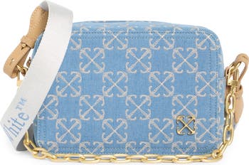 The brand's iconic crisscrossing arrow motif lends heritage appeal to a jacquard-denim camera bag detailed with leather slip pockets, inside and out.