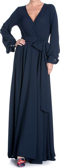 Partially lined for comfort, this maxi dress showcases a V-neckline with a cross-front design, long bell sleeves with button cuffs, an elasticized waist with a side belt and a flowing skirt.