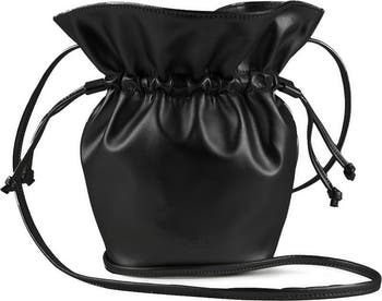 Italian-made vegan leather shapes this sustainable and slouchy bucket bag topped with a slim drawstring and slim crossbody strap.